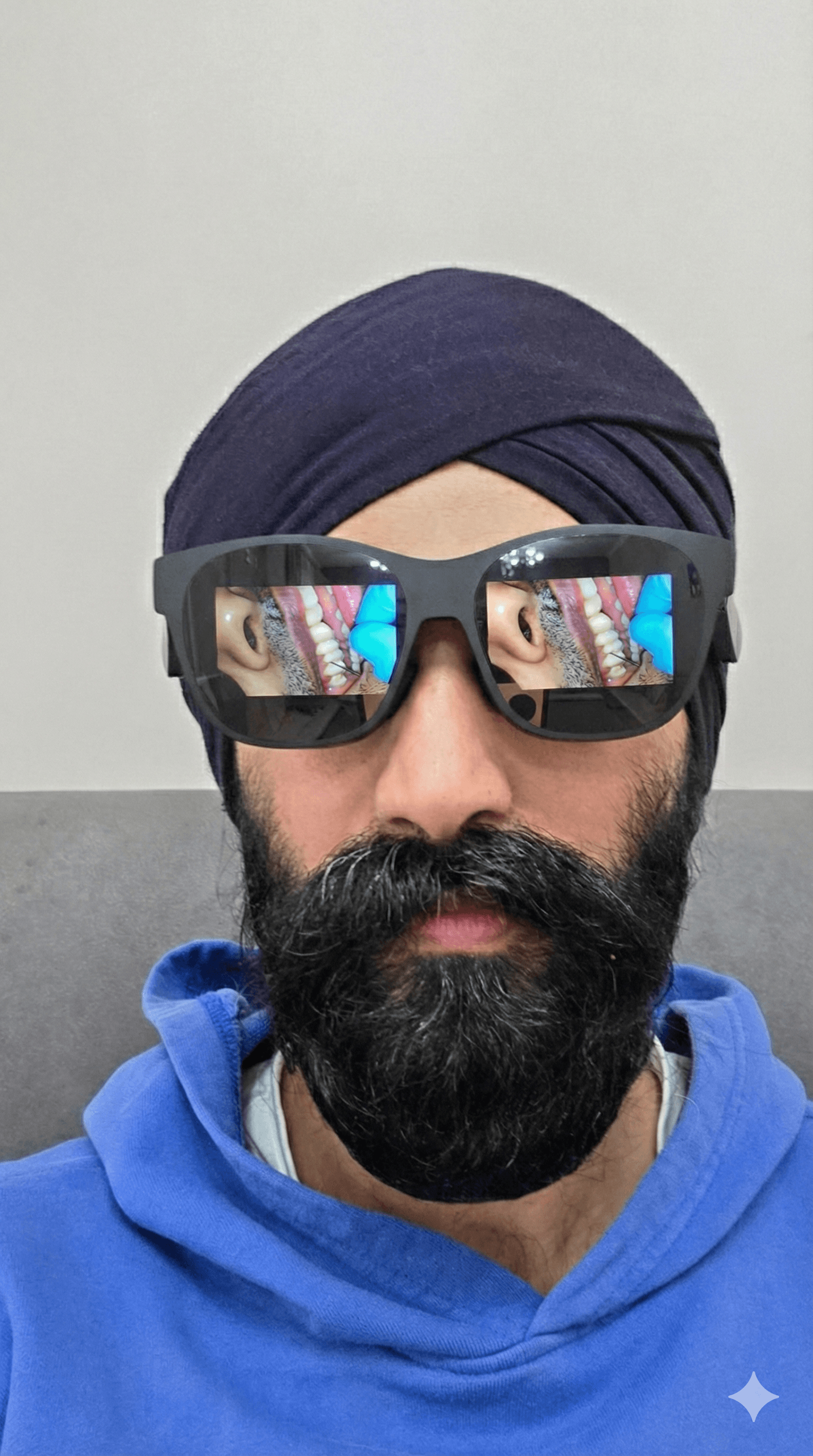 Patient wears the AR glasses. The patient puts on the Xreal glasses. They now see a floating screen (your loupe feed) in their visual field. They watch their own examination as you conduct it.